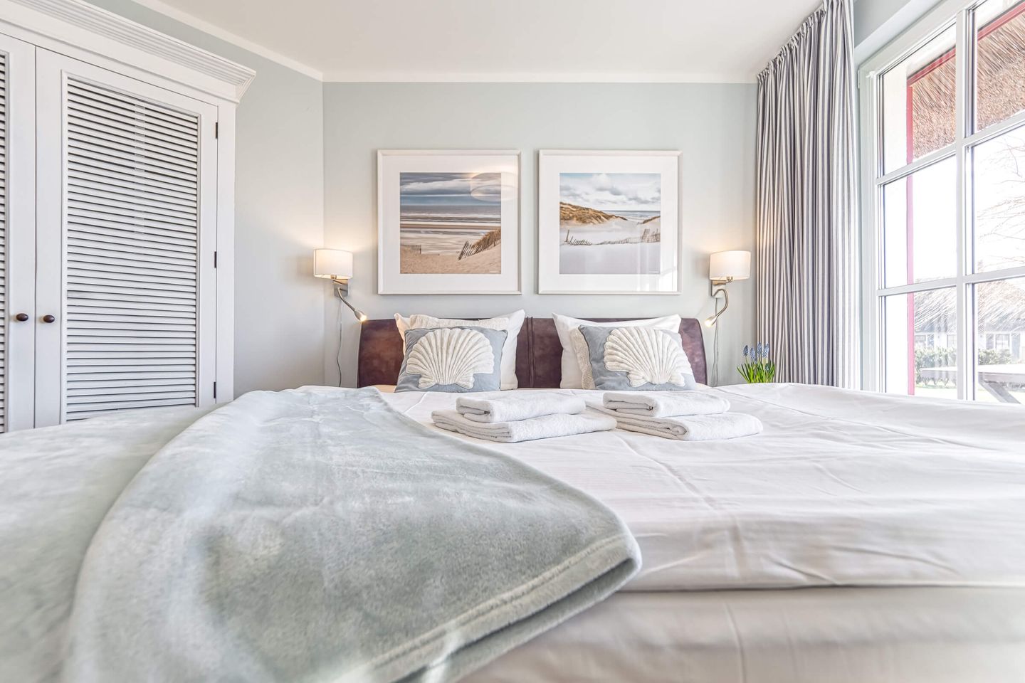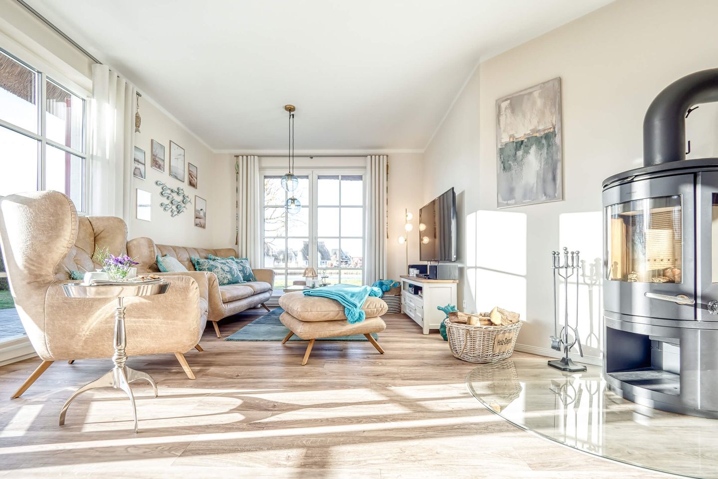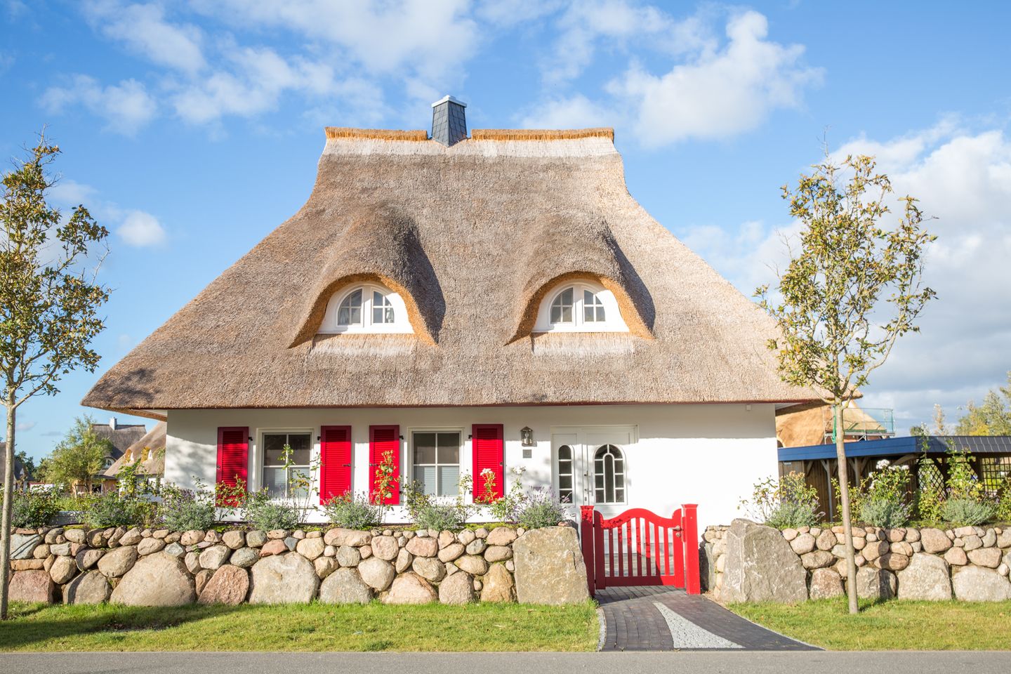Dieses wunderschöne Ferienhaus mit traditionellem Reetdach, Fensterläden, ortstypischer Feldsteineinfriedung und 681 m2 großem Grundstück am Teich liegt in einer neuen Ferienhausanlage. Es bietet großzügig Platz für sechs Feriengäste (drei Schlafzimmer mit Doppelbett und SAT-TV, davon eins im EG) und verfügt über zwei hochwertige Bäder und ein Gäste-WC, davon ein Bad mit Badewanne und Dusche, ein Bad mit Dusche und Sauna.