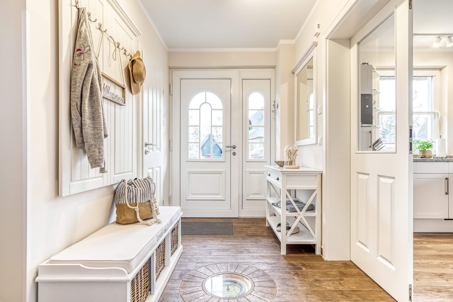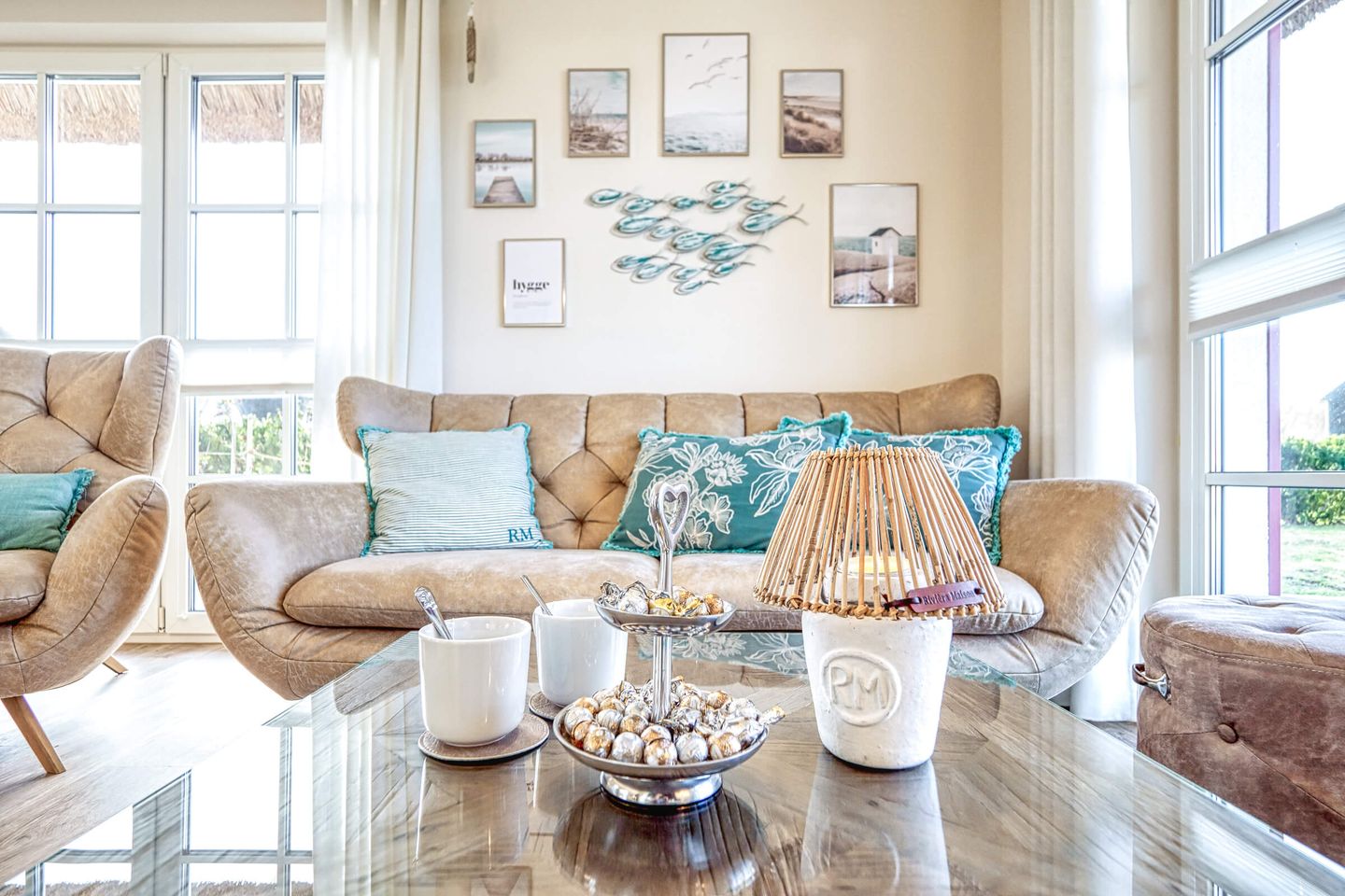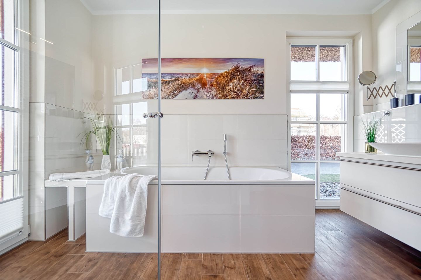 Dieses wunderschöne Ferienhaus mit traditionellem Reetdach, Fensterläden, ortstypischer Feldsteineinfriedung und 681 m2 großem Grundstück am Teich liegt in einer neuen Ferienhausanlage. Es bietet großzügig Platz für sechs Feriengäste (drei Schlafzimmer mit Doppelbett und SAT-TV, davon eins im EG) und verfügt über zwei hochwertige Bäder und ein Gäste-WC, davon ein Bad mit Badewanne und Dusche, ein Bad mit Dusche und Sauna.