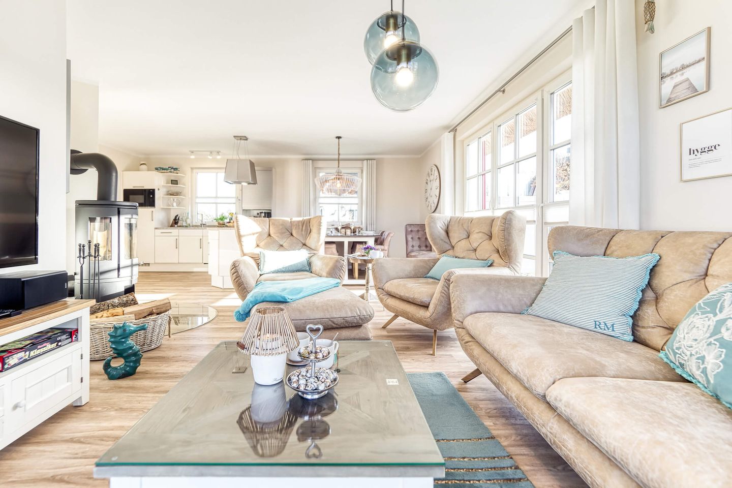 Im Erdgeschoss befindet sich ein ca. 30 qm großer Wohn-Essbereich mit gemütlichen Sitzmöglichkeiten, Kaminofen, SAT-TV mit Sky und neben einer komplett ausgestatteten Küche ist ein großer Esstisch für sechs Personen vorhanden. In dem Hauswirtschaftsraum befinden sich u.a. Waschmaschine, Bügeleisen und Bügelbrett.