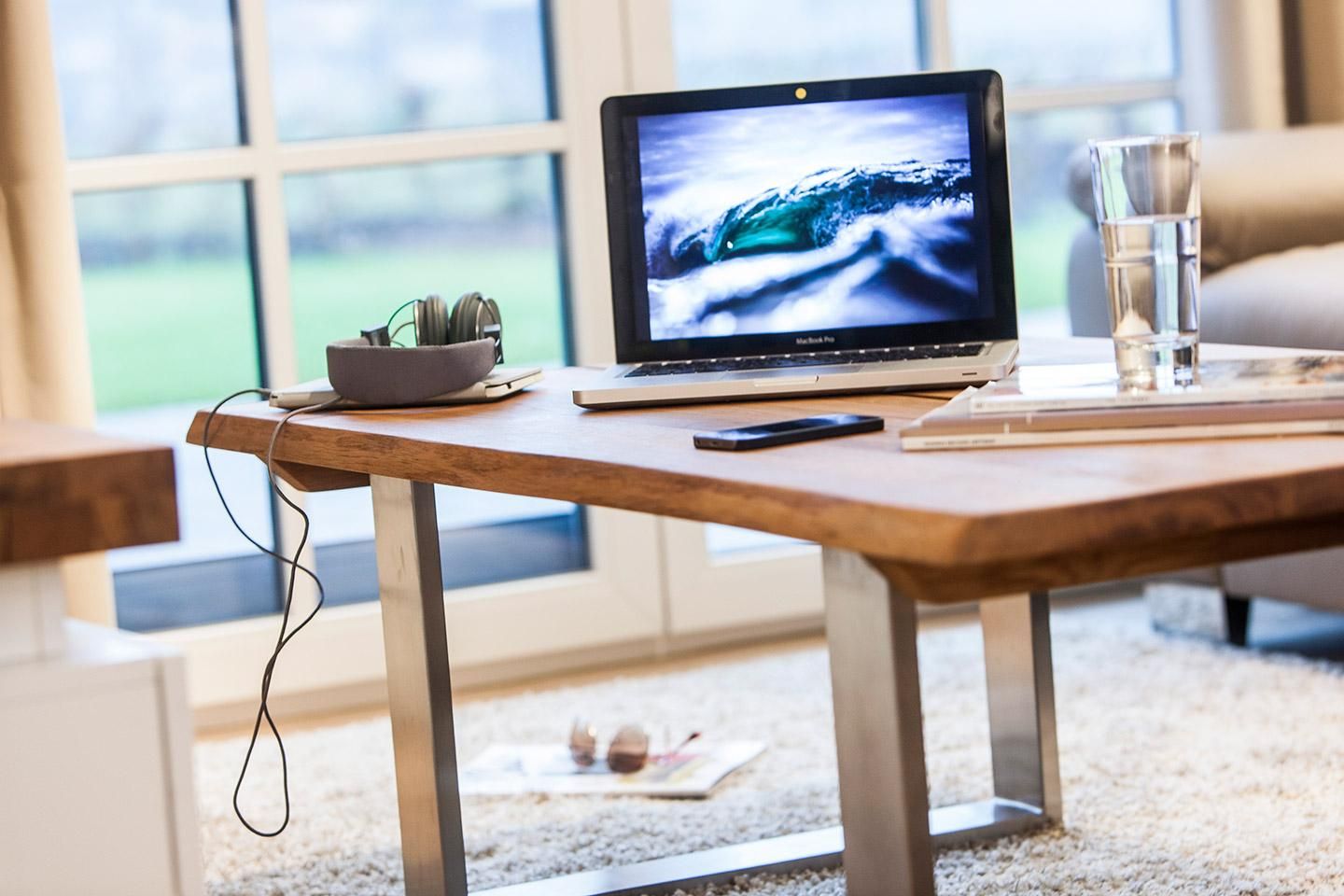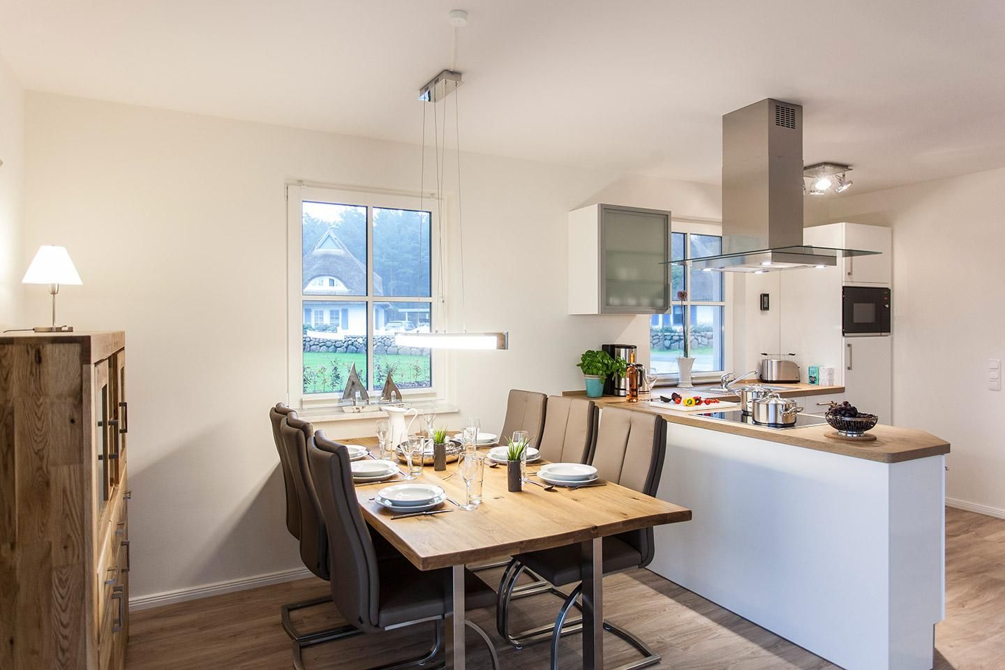 Im Erdgeschoss befindet sich ein ca. 30 qm großer Wohn-Essbereich mit gemütlichen Sitzmöglichkeiten, Kaminofen, SAT-TV mit Sky und neben einer komplett ausgestatteten Küche ist ein großer Esstisch für sechs Personen vorhanden. SAT-TV in zwei Doppelschlafzimmer. In dem Hauswirtschaftsraum befinden sich u.a. Waschmaschine, Bügeleisen und Bügelbrett und Reinigungsutensilien.