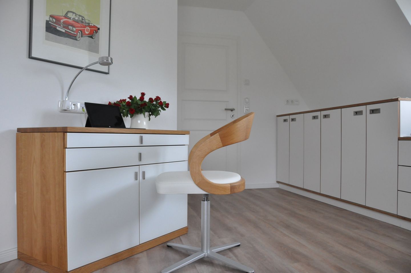 Im Erdgeschoss befindet sich ein ca. 30 qm großer Wohn-Essbereich mit gemütlichen Sitzmöglichkeiten, Kaminofen, SAT-TV mit Sky und neben einer komplett ausgestatteten Küche mit Kaffeevollautomat ist ein großer Esstisch für sechs Personen vorhanden. In dem Hauswirtschaftsraum befinden sich u.a. Waschmaschine, Bügeleisen und Bügelbrett und Reinigungsutensilien.