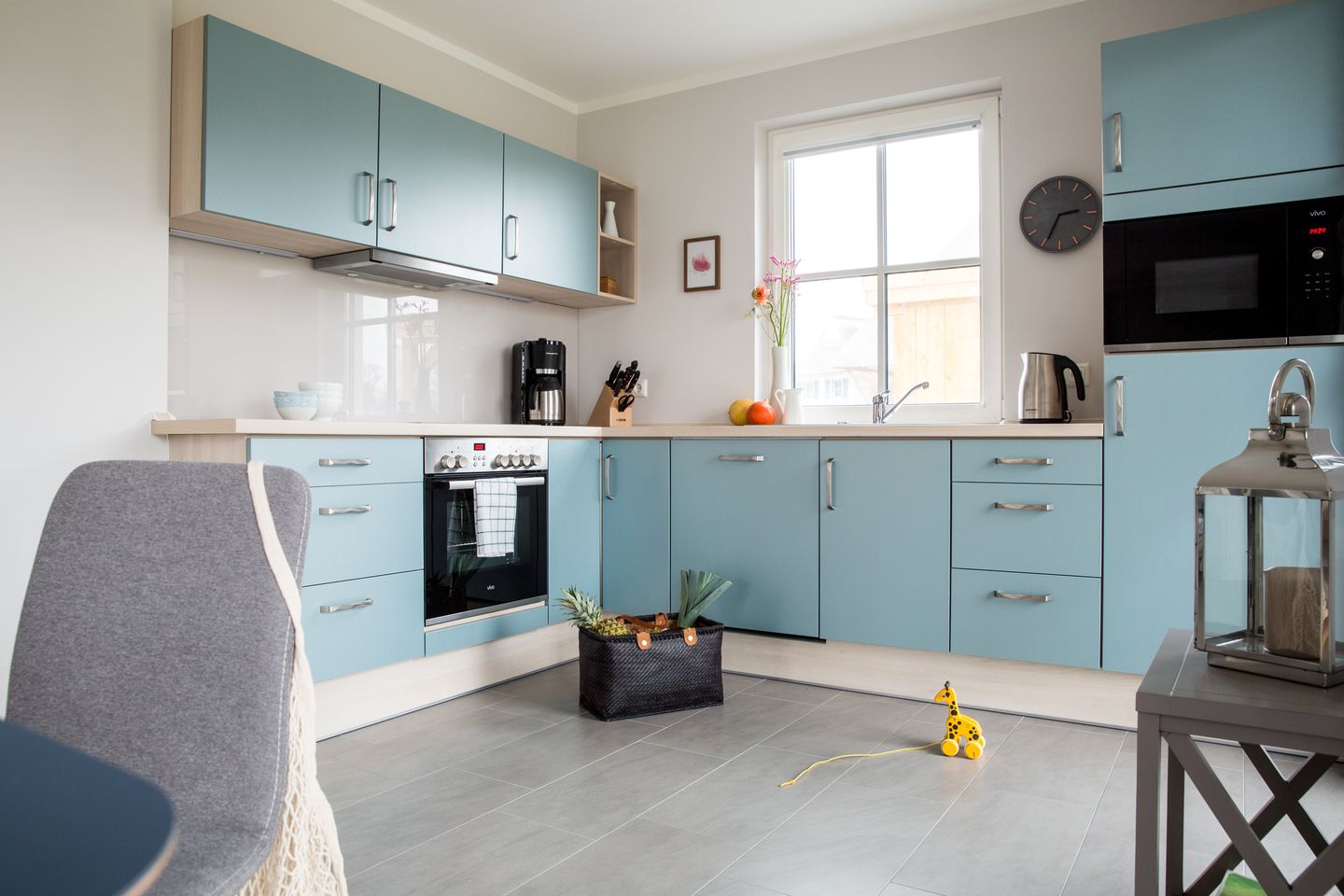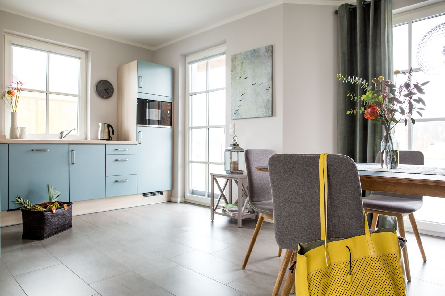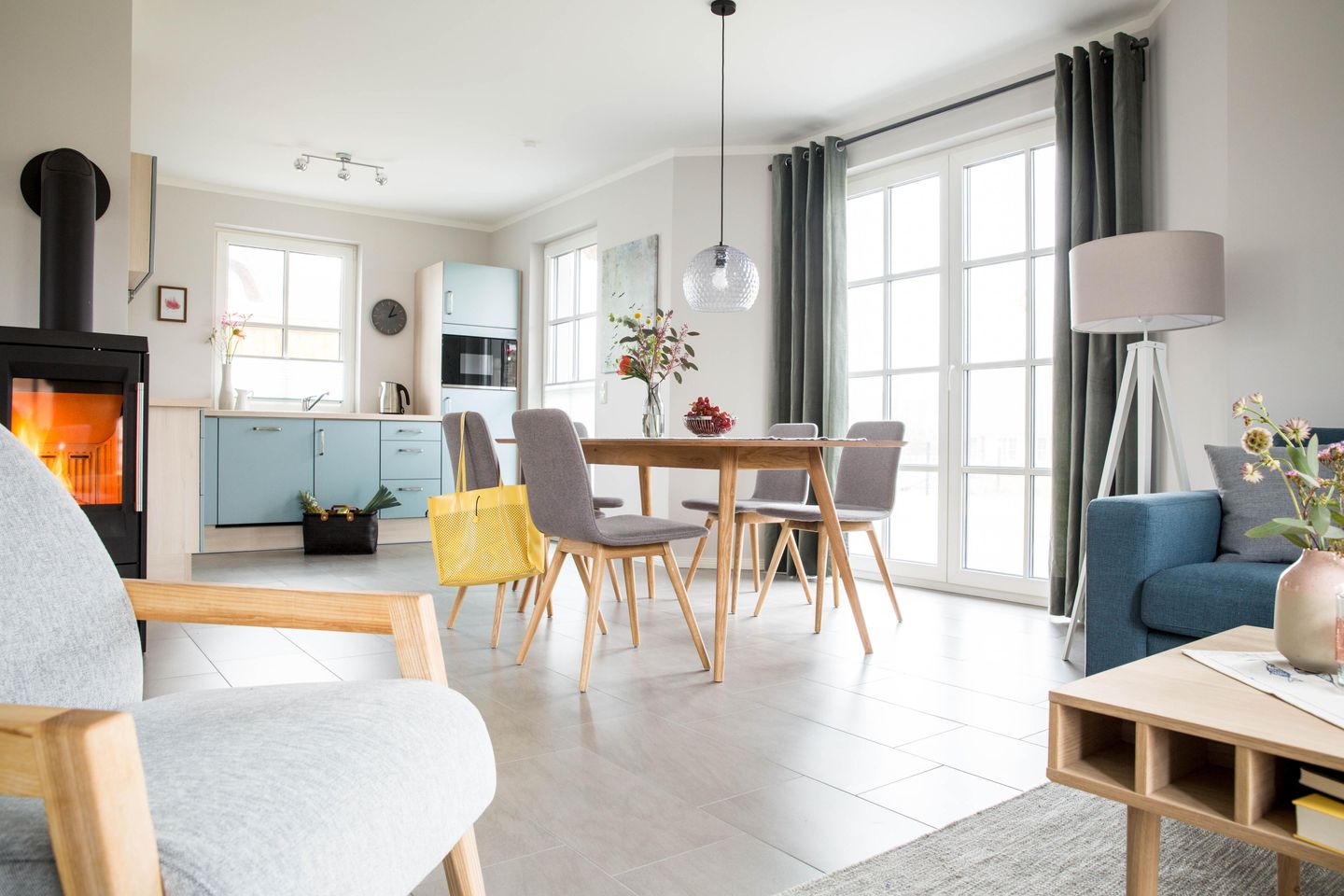 Im EG befindet sich ein ca. 30 qm großer Wohn-Essbereich mit gemütlicher Couch, Kaminofen, SAT-TV mit Sky und neben einer komplett ausgestatteten Küche ist ein Esstisch für 4 Personen vorhanden.