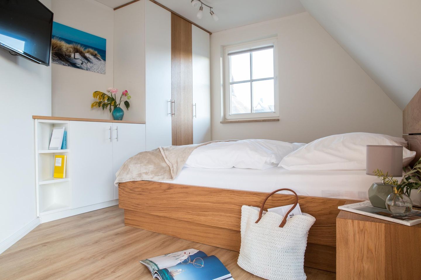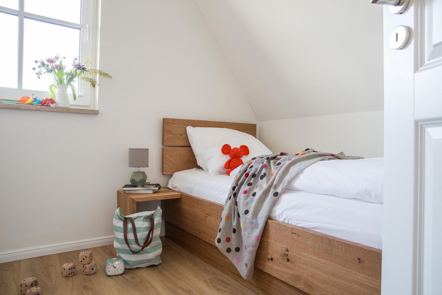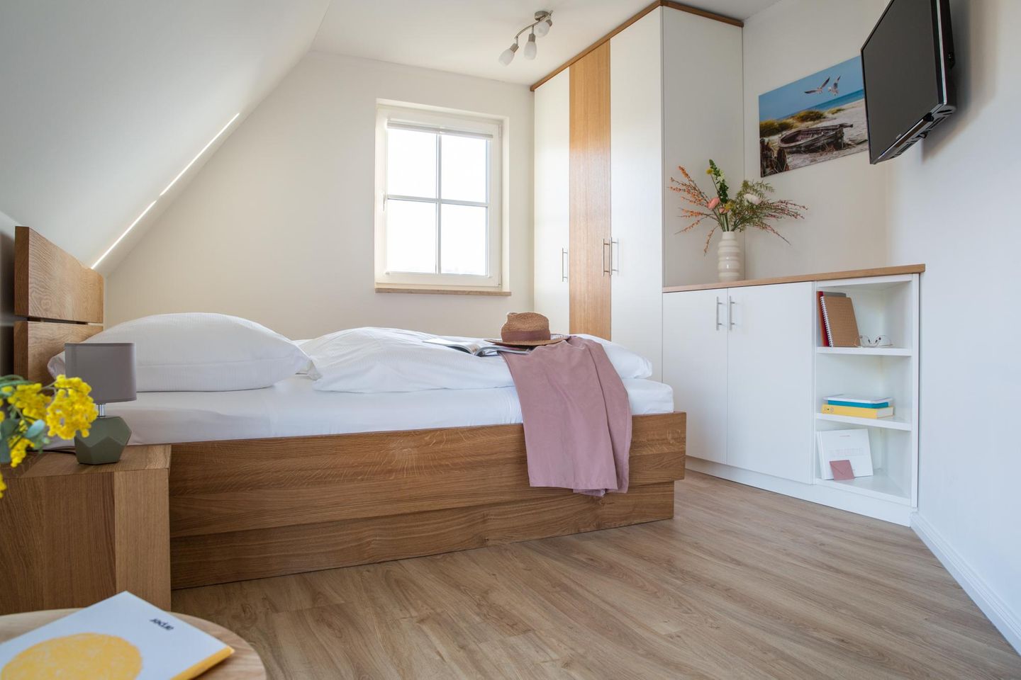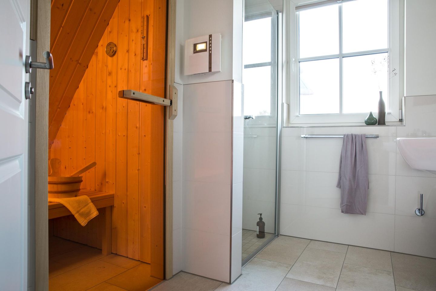 Das wunderschöne Ferienhaus mit traditionellem Reetdach, Fensterläden, ortstypischer Feldsteineinfriedung und 653 m2 großem Grundstück liegt in einer neuen Ferienhausanlage. Es bietet großzügig Platz für fünf Feriengäste (zwei Schlafzimmer mit Doppelbett, eins mit Einzelbett) und verfügt über ein Duschbad mit WC und Sauna im OG sowie ein Gäste-WC im EG.