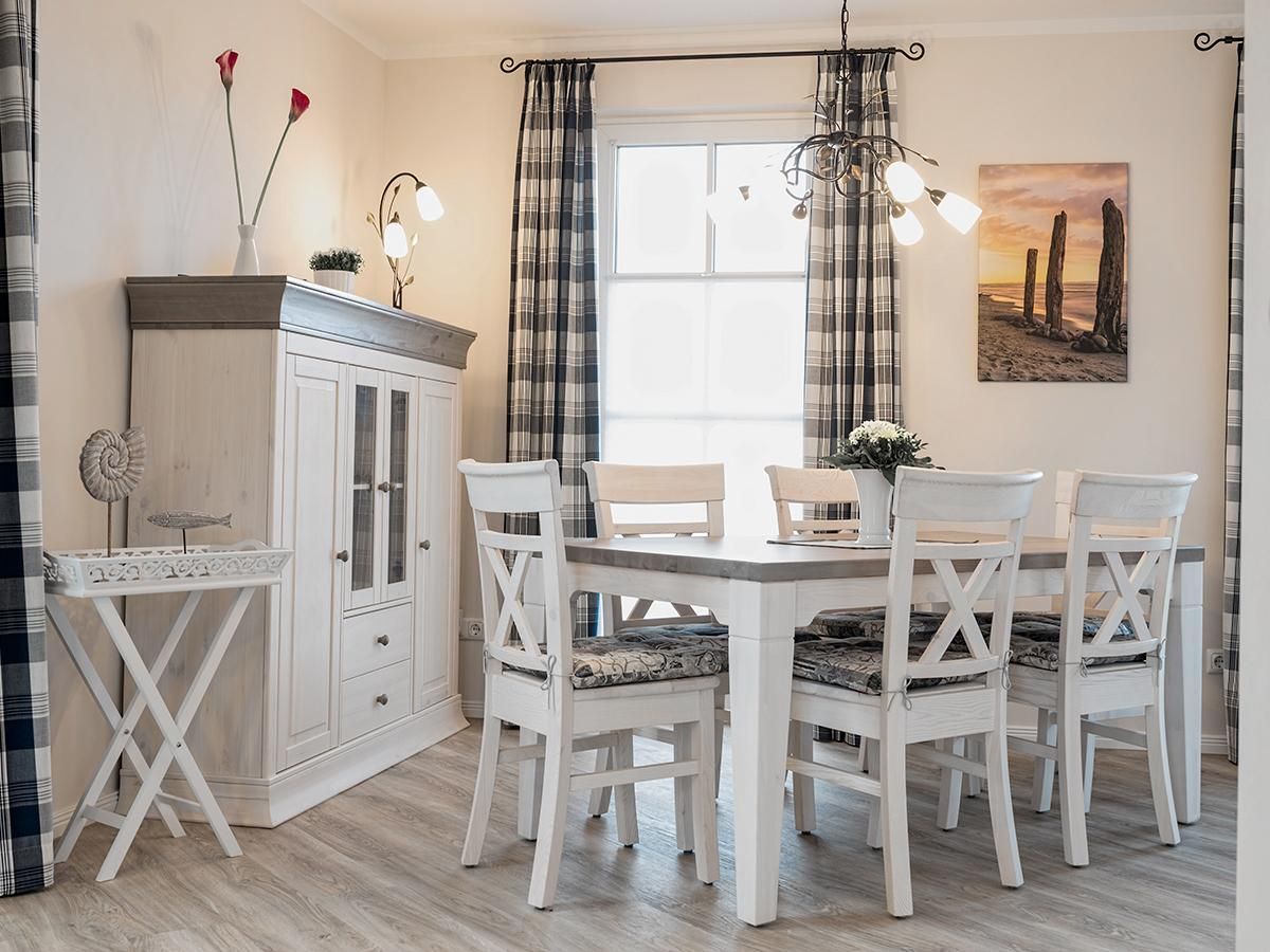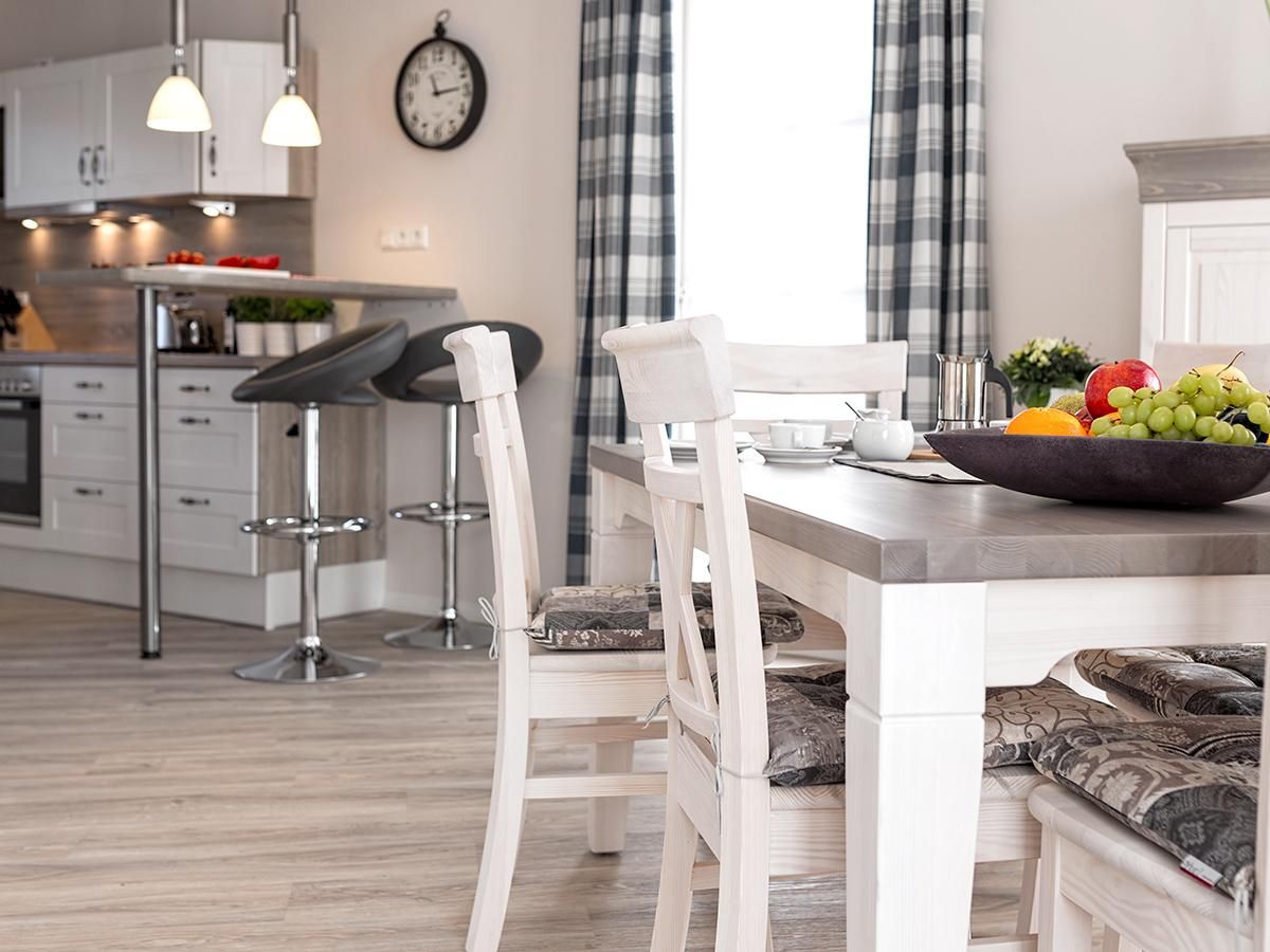 Im EG befindet sich ein ca. 30 qm großer Wohn-Essbereich mit gemütlicher Couchecke, Kaminofen, SAT-TV mit Sky und neben einer komplett ausgestatteten Küche ist ein Esstisch für 6 Personen vorhanden. Die großzügige Terrasse bietet einen herrlichen Blick auf den Teich und viel Morgen- und Abendsonne.