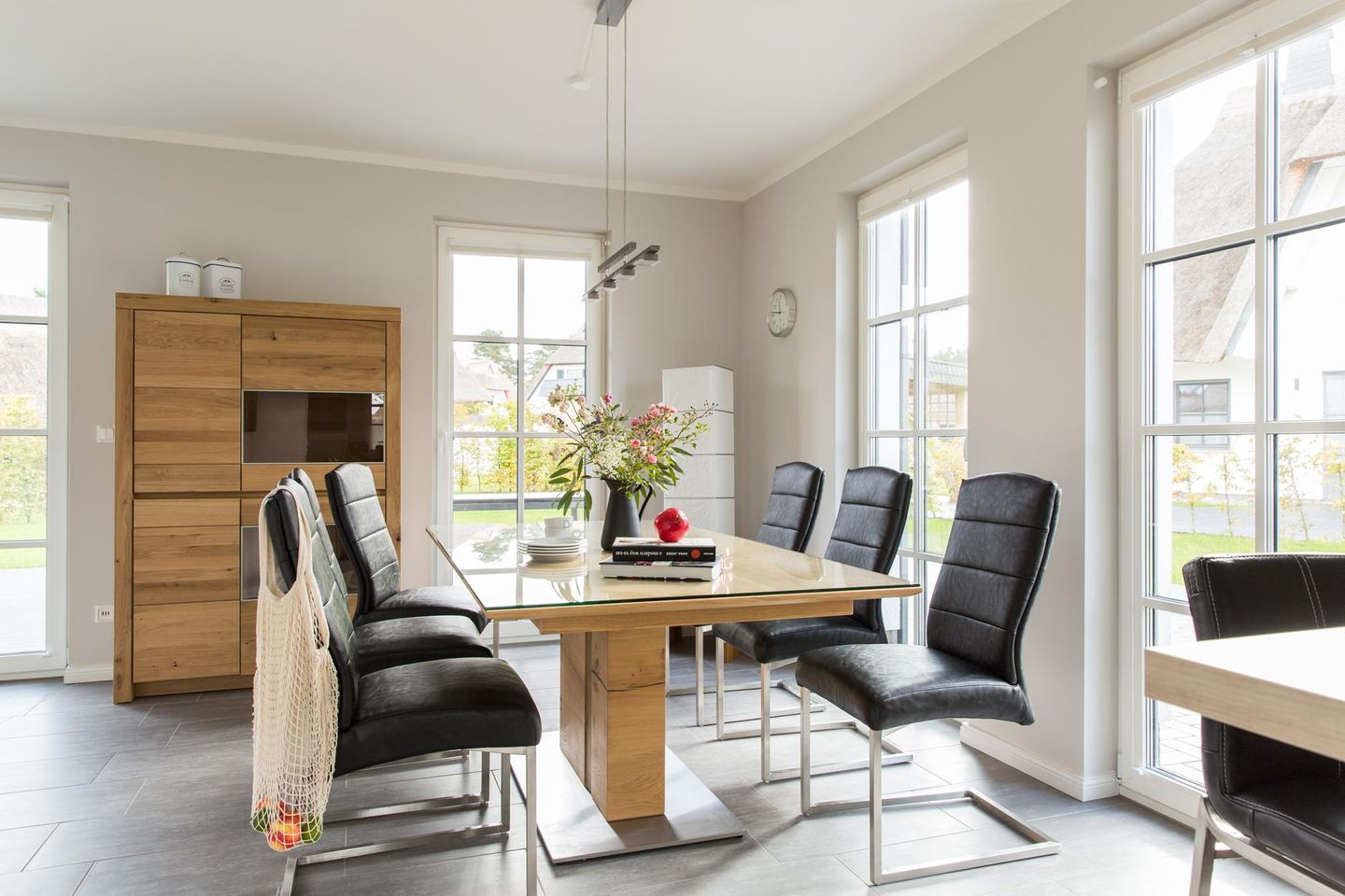 Im EG befindet sich ein ca. 30 qm großer Wohn-Essbereich mit gemütlicher Couchecke, Kaminofen, SAT-TV mit Sky und neben einer komplett ausgestatteten Küche ist ein Esstisch für 6 Personen vorhanden. Die großzügige Terrasse bietet einen herrlichen Blick auf den Teich und viel Morgen- und Abendsonne.