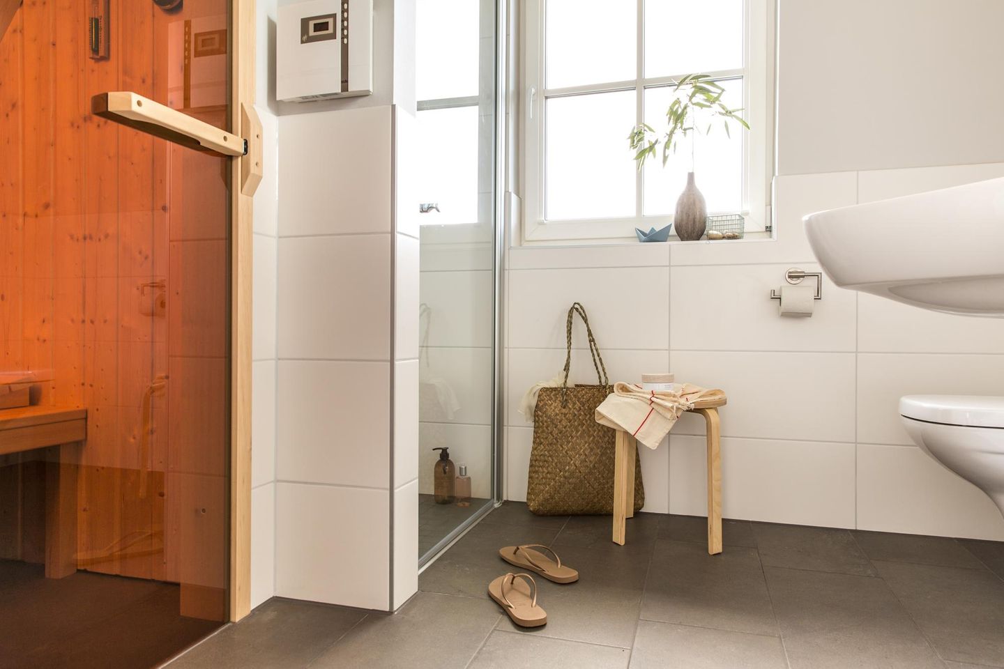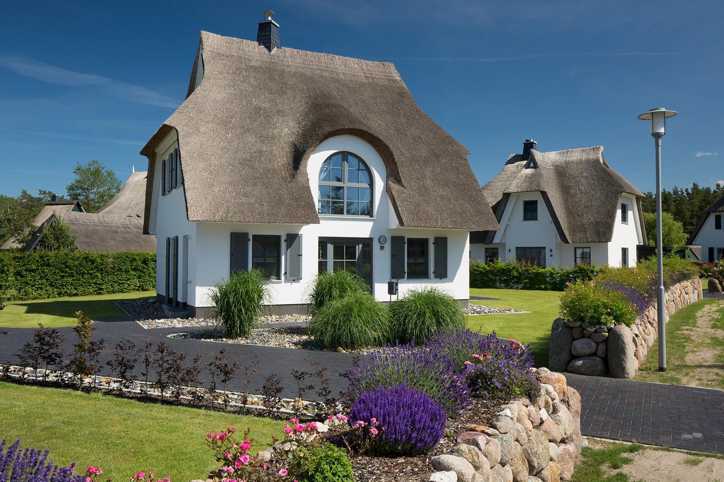 Das wunderschöne Ferienhaus mit traditionellem Reetdach, Fensterläden, ortstypischer Feldsteineinfriedung und 653 m2 großem Grundstück liegt in einer neuen Ferienhausanlage. Es bietet großzügig Platz für fünf Feriengäste (zwei Schlafzimmer mit Doppelbett, eins mit Einzelbett) und verfügt über ein Duschbad mit WC und Sauna im OG sowie ein Gäste-WC im EG.