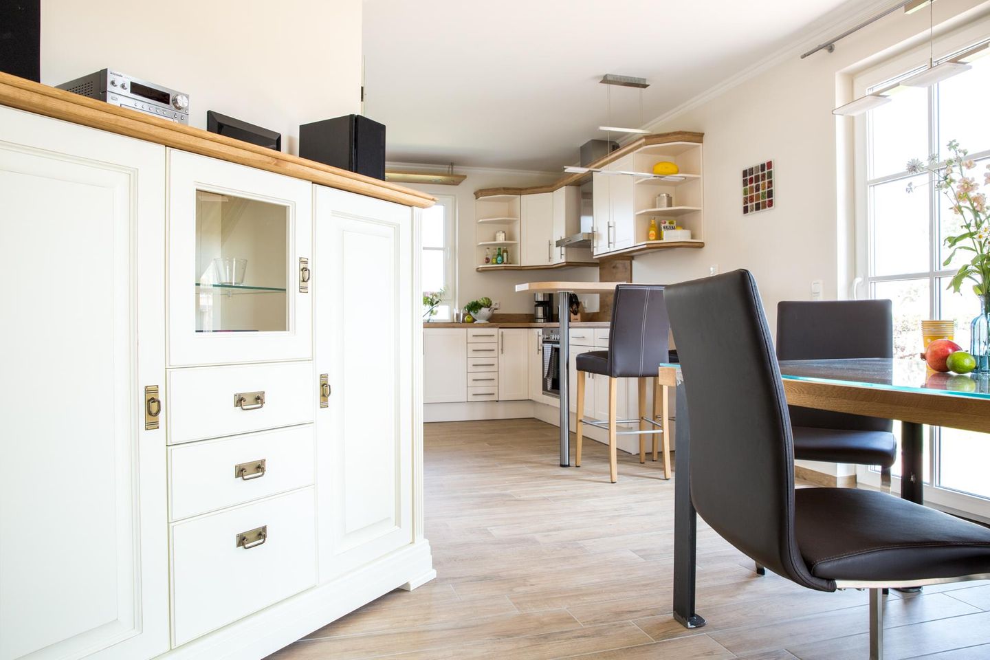 Im EG befindet sich ein ca. 30 qm großer Wohn-Essbereich mit gemütlicher Couchecke, Kaminofen, SAT-TV mit Sky und neben einer komplett ausgestatteten Küche ist ein Esstisch für 6 Personen vorhanden. Die großzügige Terrasse bietet viel Morgen- und Abendsonne.