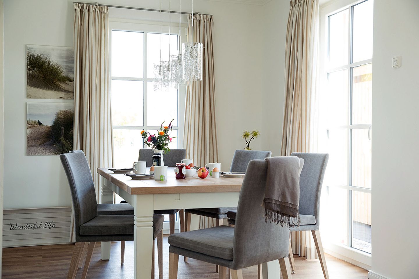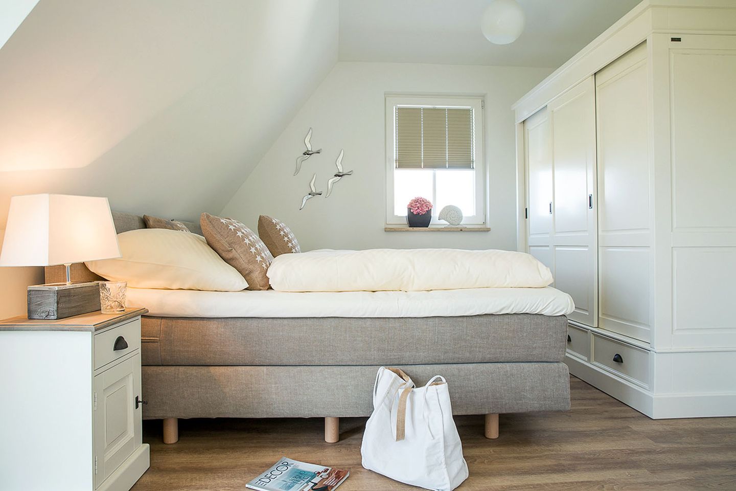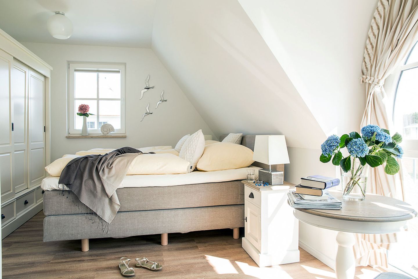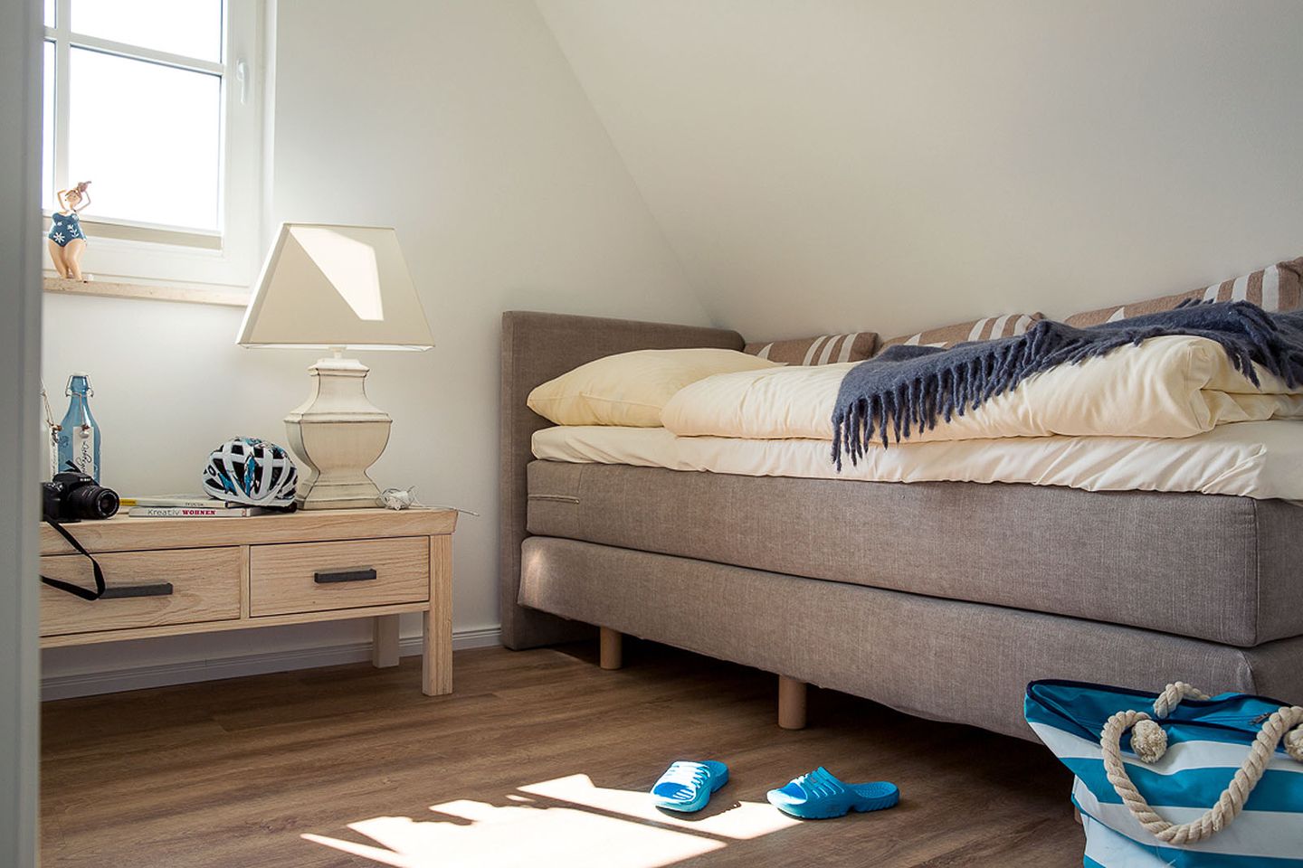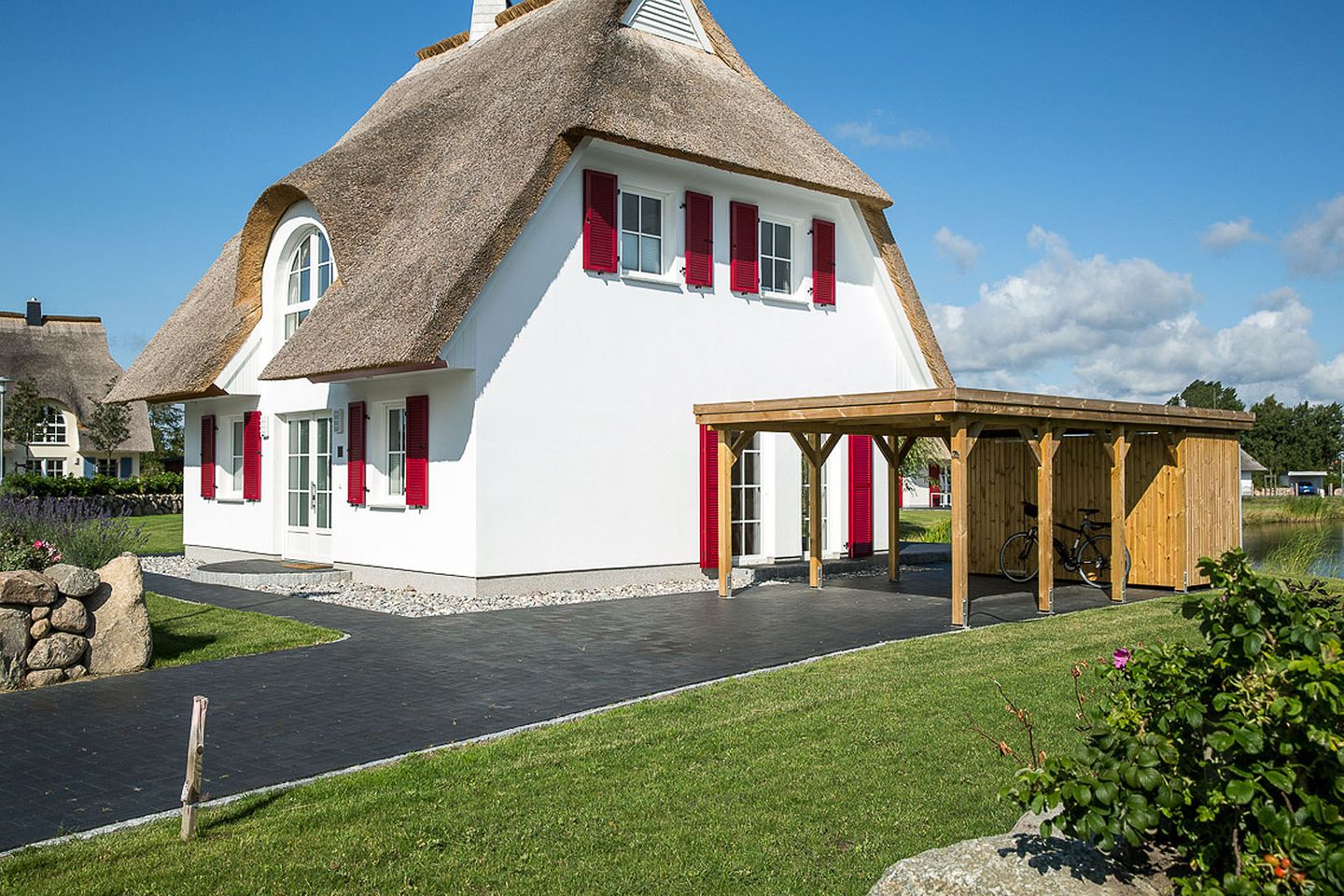 Das wunderschöne Ferienhaus mit traditionellem Reetdach, Fensterläden, ortstypischer Feldsteineinfriedung und 611 m2 großem Grundstück liegt in einer neuen Ferienhausanlage. Es bietet großzügig Platz für fünf Feriengäste (zwei Schlafzimmer mit Doppelbett, eins mit Einzelbett) und verfügt über ein Duschbad mit WC und Sauna im OG sowie ein Gäste-WC im EG.